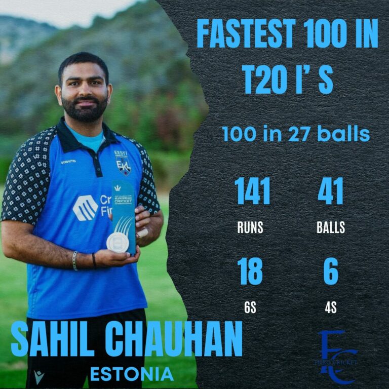 EUROCRICKETNEWS Blazing Blitz: Fastest-Ever Men’s T20I Century Smashed in Just 27 Balls editor_eurocricketJune 17, 2024June 17, 20240 In an extraordinary display of power-hitting, Estonia’s Sandeep Chauhan etched his name into the record books by smashing the fastest-ever…